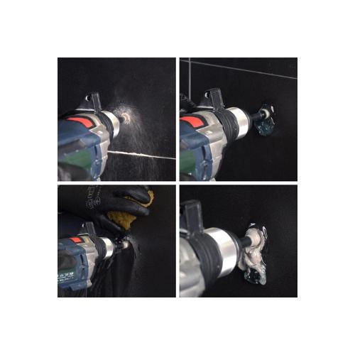 Postoji rješenje – rashladni gel za bušenje CoolGEL. Nakon označavanja radne površine, gel se nanosi na područje buduće rupe. Tijekom bušenja, gel upija produkte rezanja, veže ih kako bi spriječio njihovo širenje. Osim toga, dolazi do učinkovitog hlađenja svrdla, što je jednako dobro kao vodeno hlađenje. To povećava brzinu bušenja i održava dug vijek trajanja svrdla. Nakon bušenja dovoljno je obrisati mjesto bušenja salvetom i sve je čisto i suho.